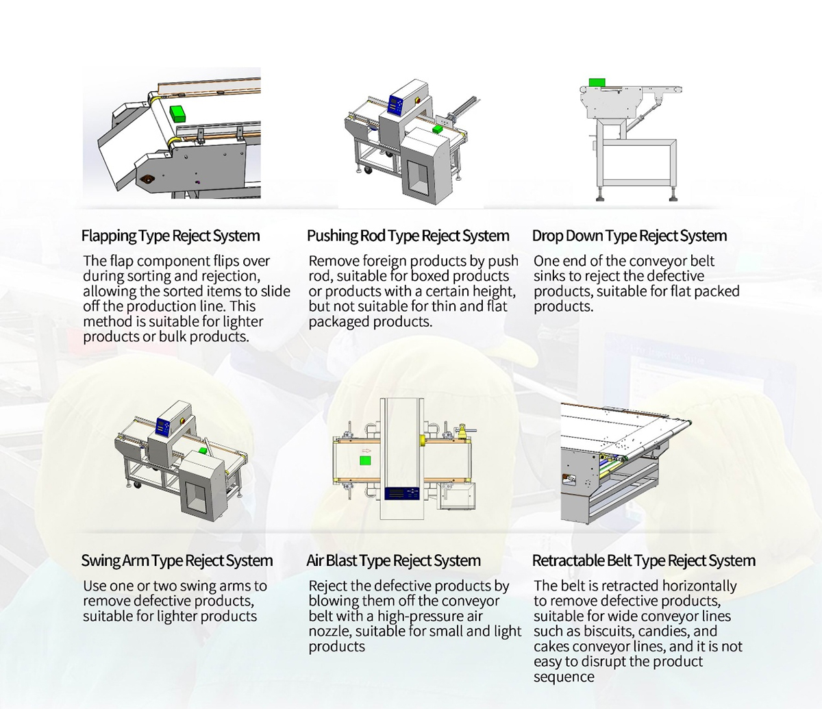 1.The above sensitivity is tested by standard testing piece in empty running conveyor, while the actual sensitivity with products will depend on the type, dimension, weight, package, composition, status of the products, position of the mixed contaminants and environment factors, etc.